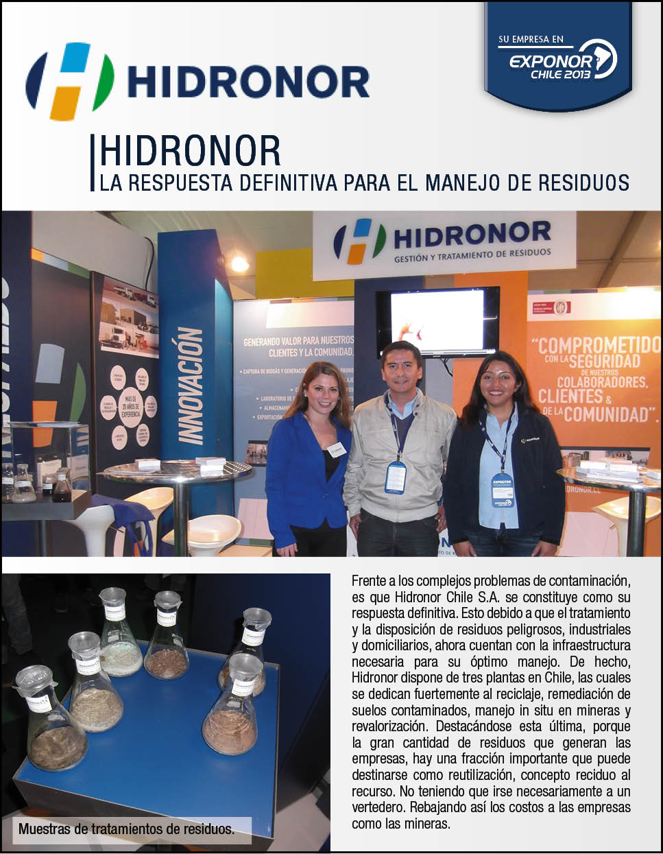 Hidronor ha estado participando en los nuevos desafíos de la Industria Minera en Chile, aportando valor a sus clientes en la gestión y tratamiento de residuos peligrosos. Durante el encuentro minero, Hidronor recibió en su stand a un sin número de personas y representantes de diferentes empresas, autoridades y comunidades. Colaborando con el desarrollo sustentable de la región y el país, Hidronor se ha convertido en un importante socio estratégico de la gran minería y de la industria en torno a los servicios mineros. En esta Feria se dio lugar para importantes encuentros, sinergias y nuevos negocios en pro de resolver los principales retos operacionales y requerimientos de abastecimiento de servicios del mismo modo que se abarcaron temas relacionados con la gestión integral de residuos peligrosos y contratos.